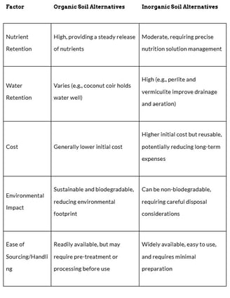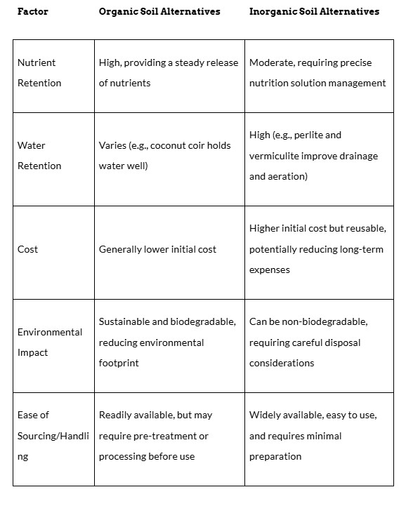 Here's a table comparing key factors for organic and inorganic soil alternatives: